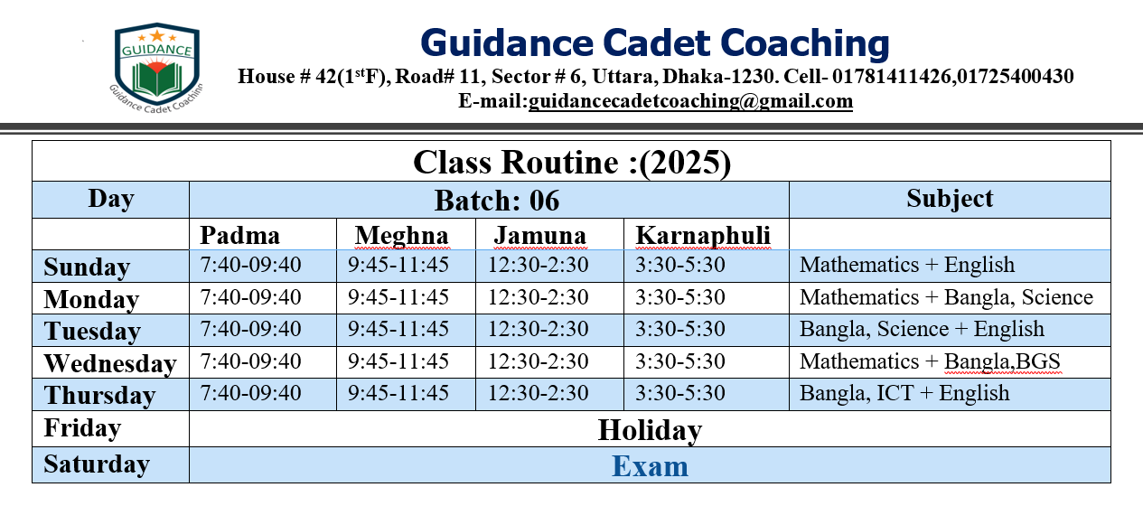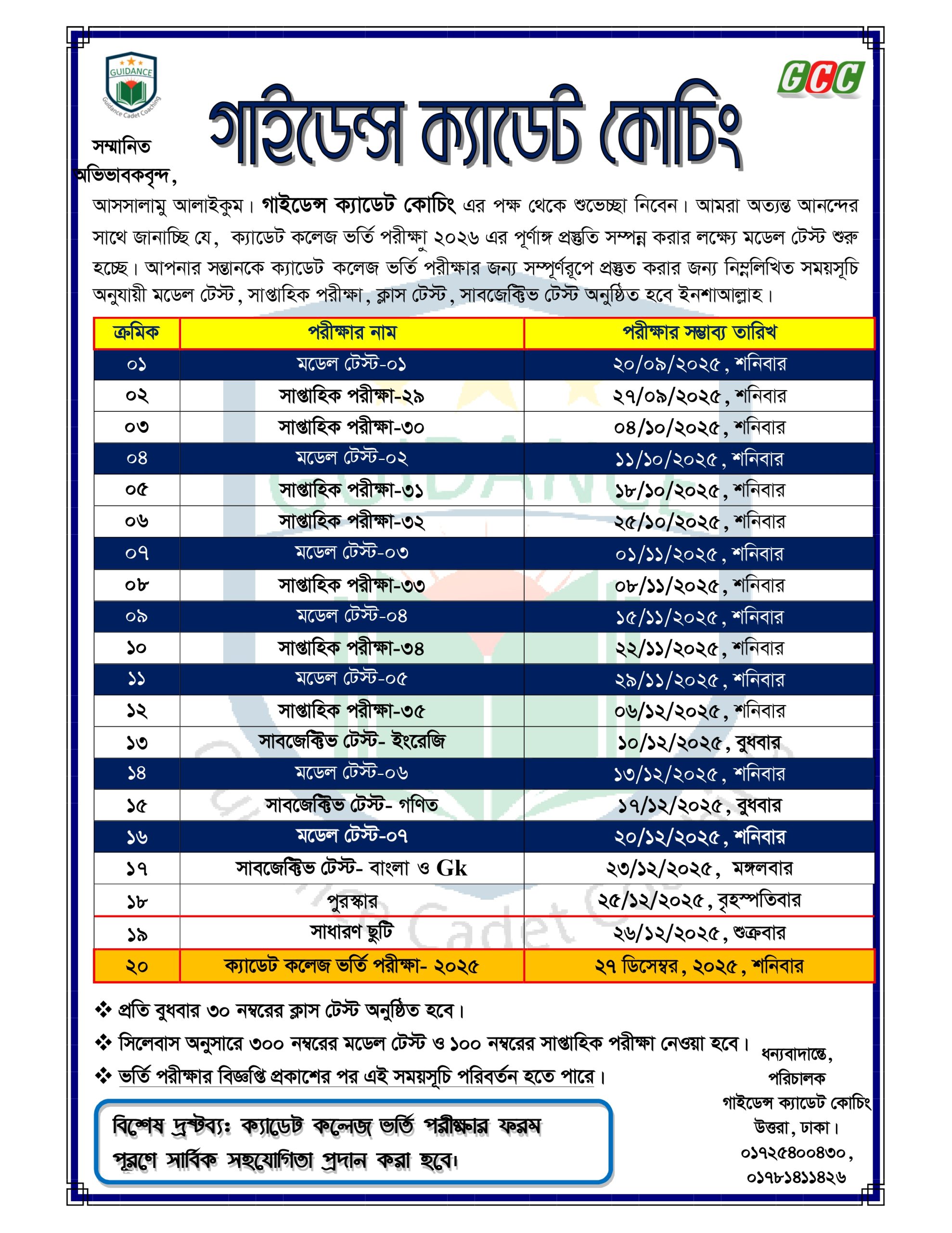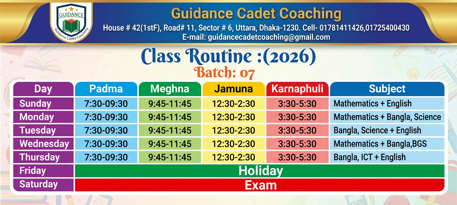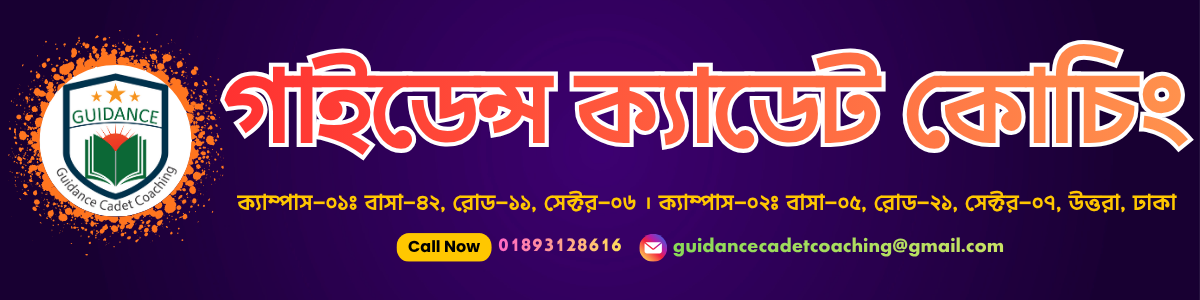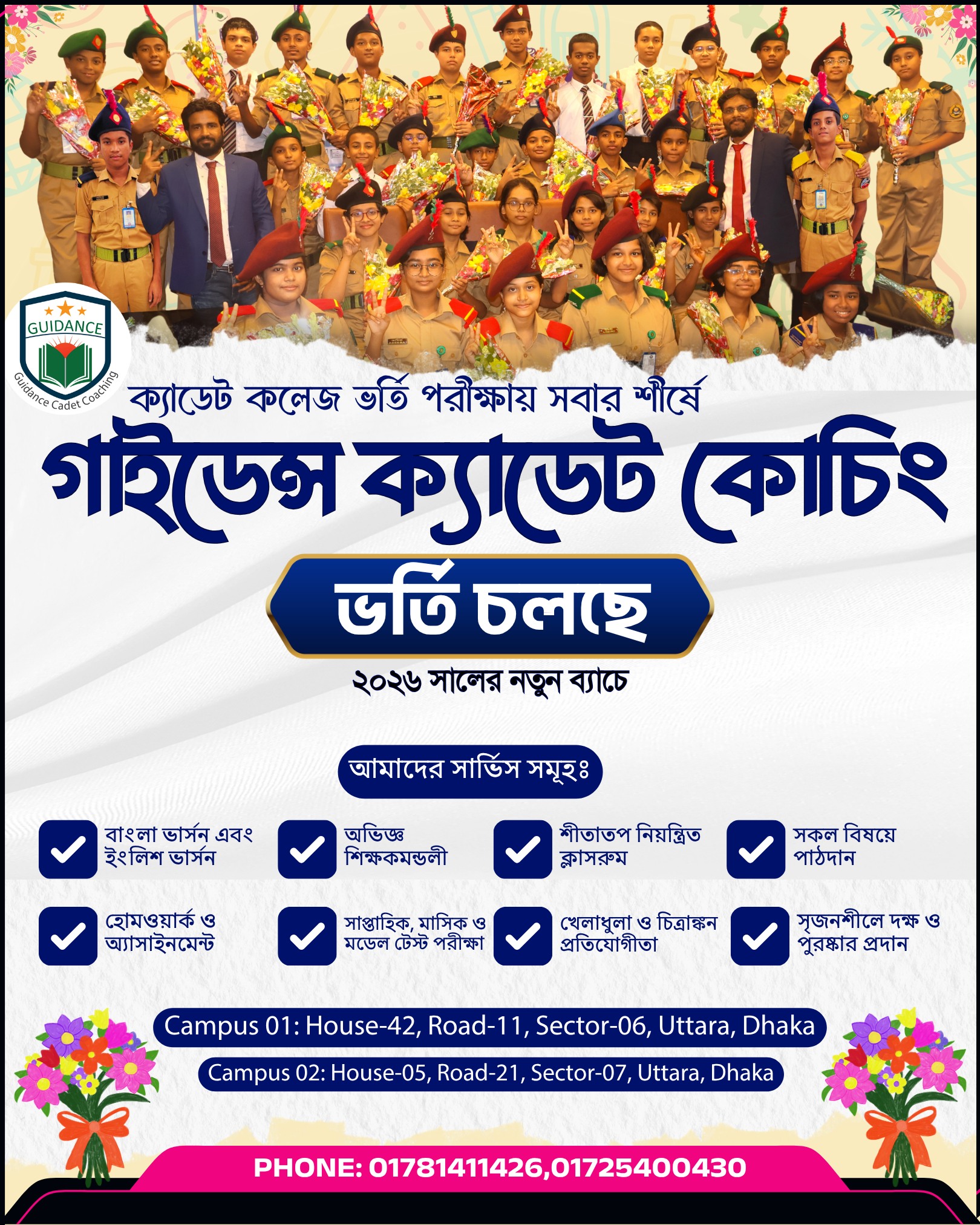 গাইডেন্স ক্যাডেট কোচিং ২০২০ সালে প্রতিষ্ঠিত একটি স্বনামধন্য শিক্ষা প্রতিষ্ঠান। প্রতিষ্ঠার পর থেকেই এটি শিক্ষার্থীদের মানসম্মত শিক্ষা ও সঠিক দিকনির্দেশনা প্রদানের মাধ্যমে অভিভাবক ও শিক্ষার্থীদের আস্থার প্রতীক হিসেবে প্রতিষ্ঠিত হয়েছে।